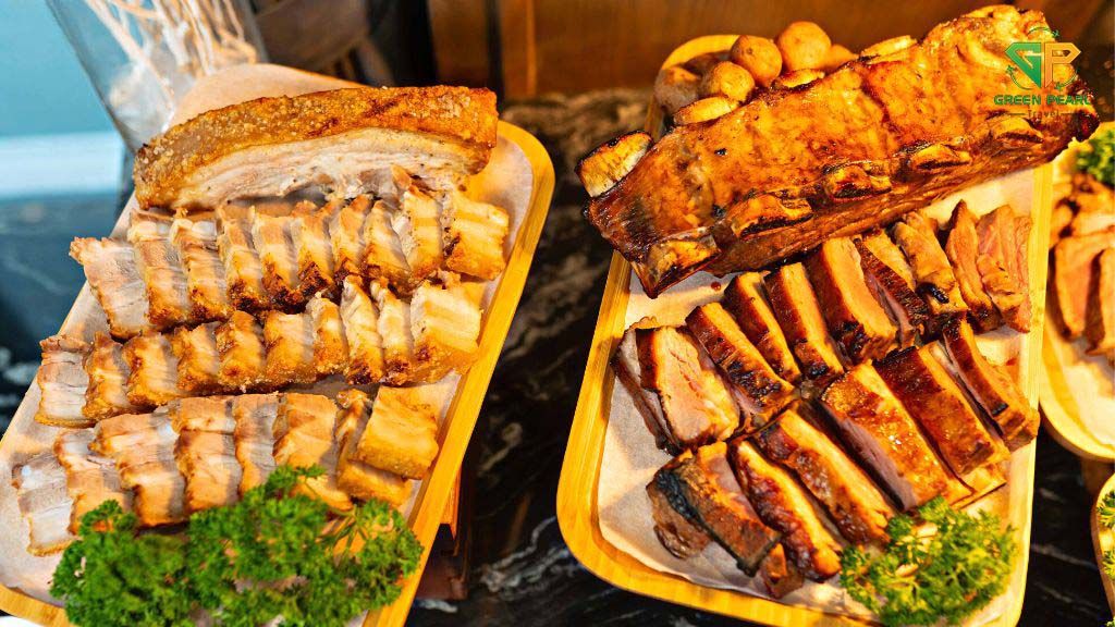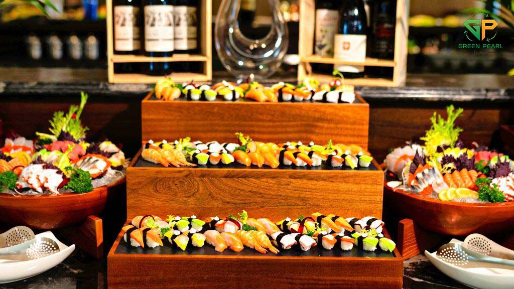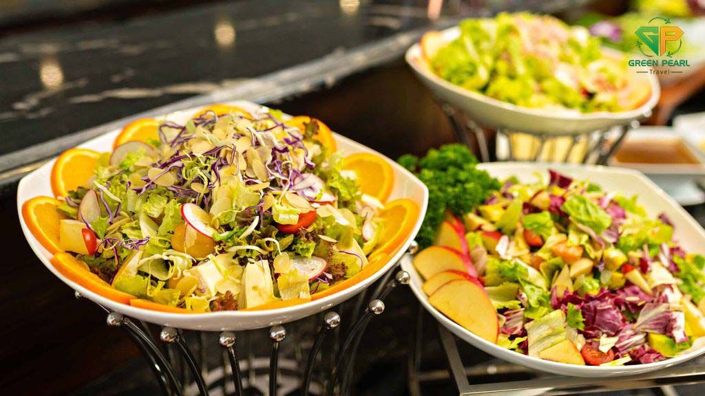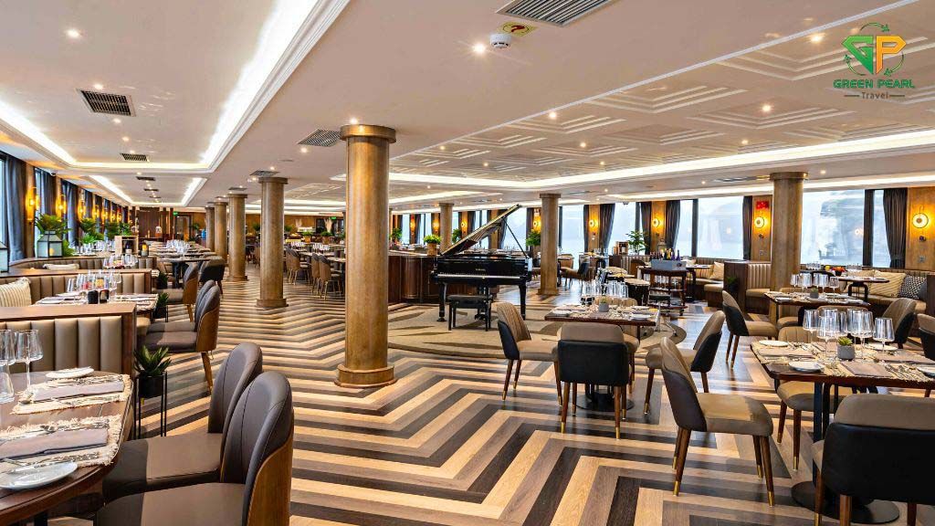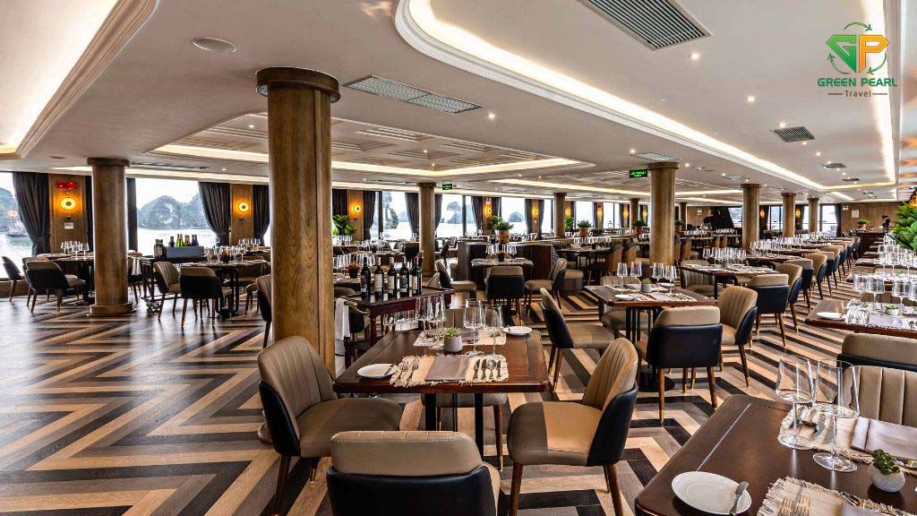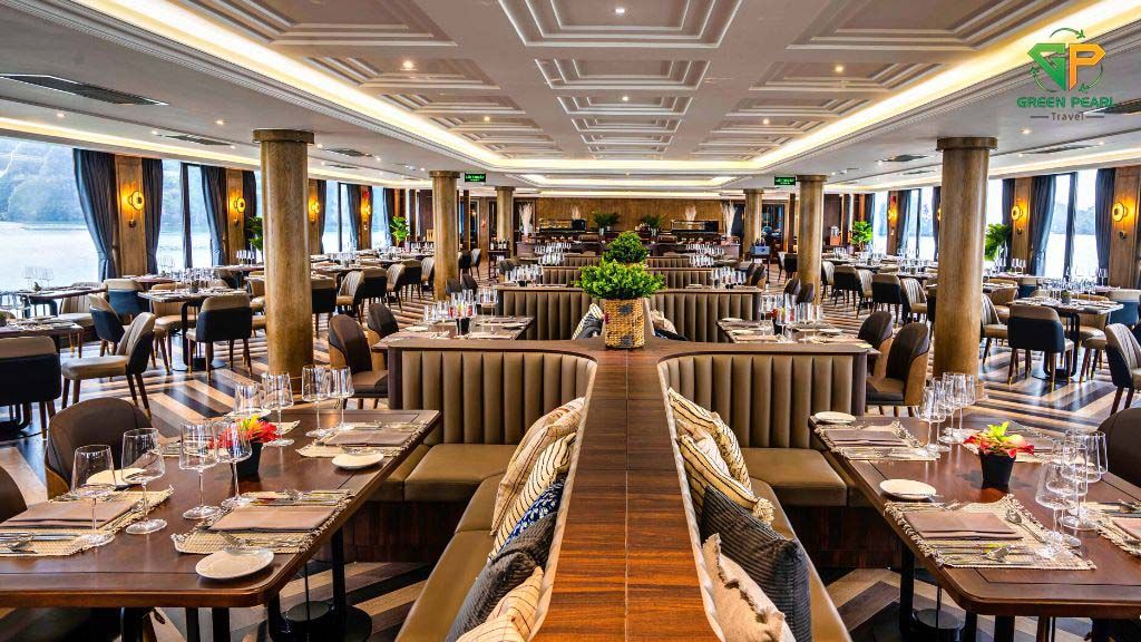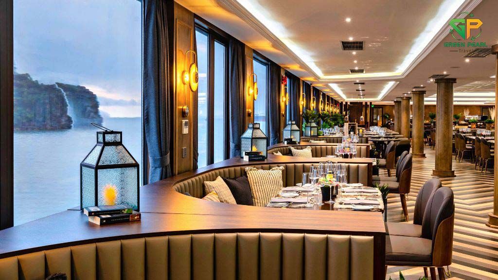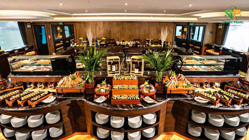 Trên du thuyền, bạn sẽ được thưởng thức thực đơn buffet hoặc set menu phong phú với các món hải sản tươi ngon và đặc sản địa phương, do các đầu bếp hàng đầu chế biến.