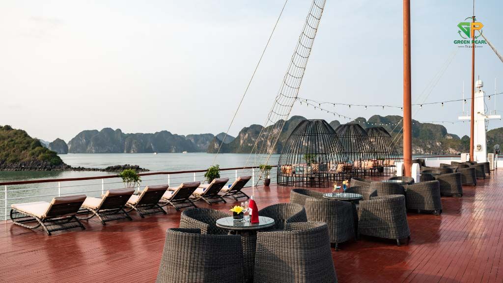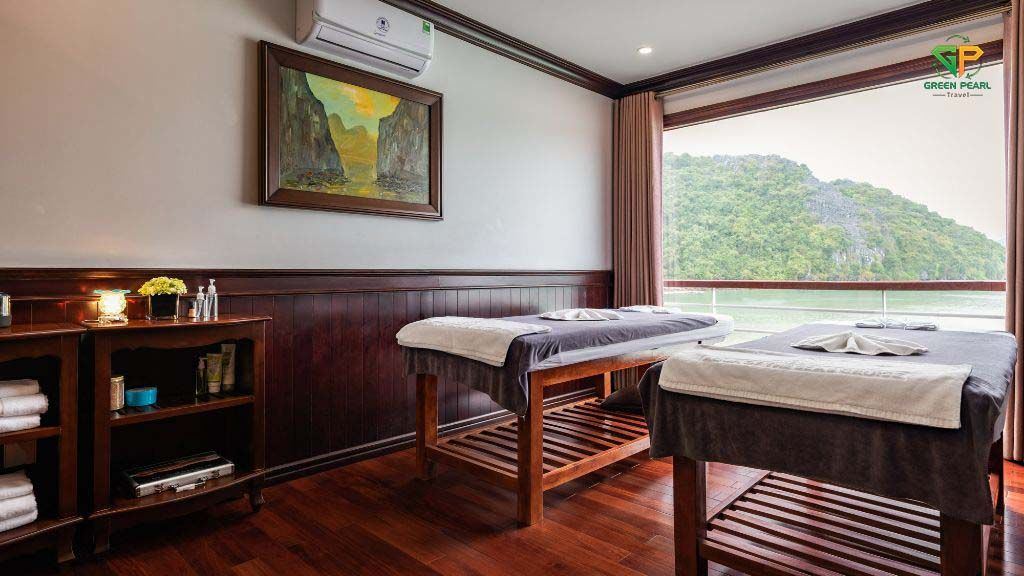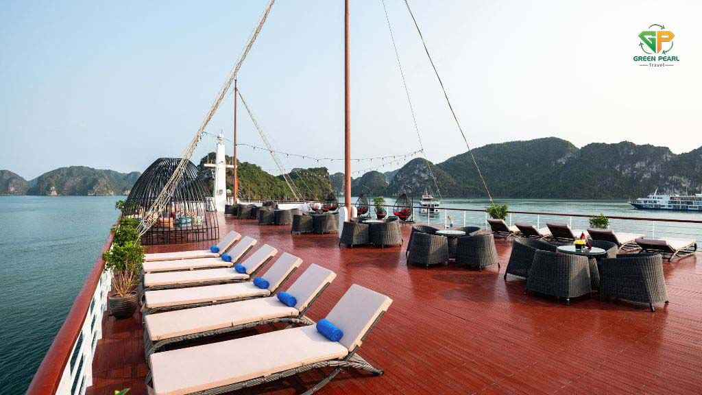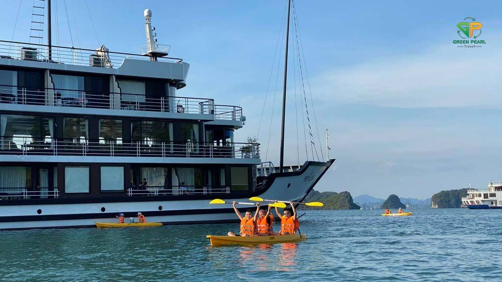Du khách có thể tham gia chèo kayak, lặn biển, tham quan hang động, hay thư giãn tại spa, bể bơi và quầy bar sang trọng trên boong tàu.
