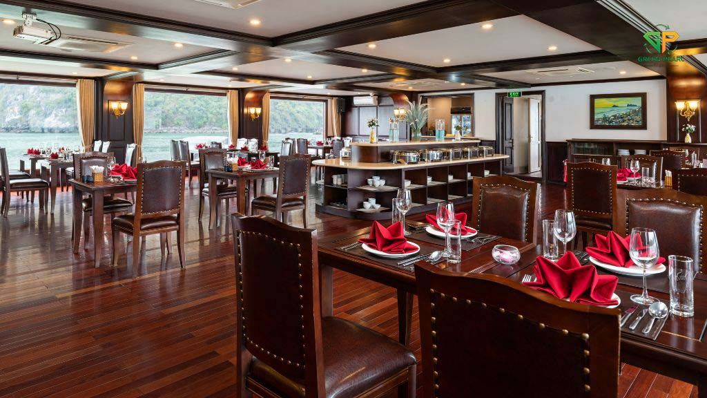 Nhà hàng trên du thuyền phục vụ thực đơn đa dạng với hải sản tươi ngon, ẩm thực quốc tế và đặc sản địa phương do các đầu bếp hàng đầu chế biến.